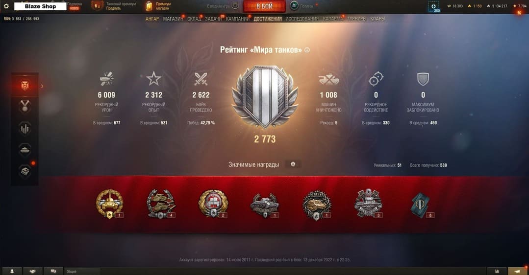 🎌Количество боев: 21 000; 🏆Процент побед: 51%; 💰Количество кредитов: 3.7 млн