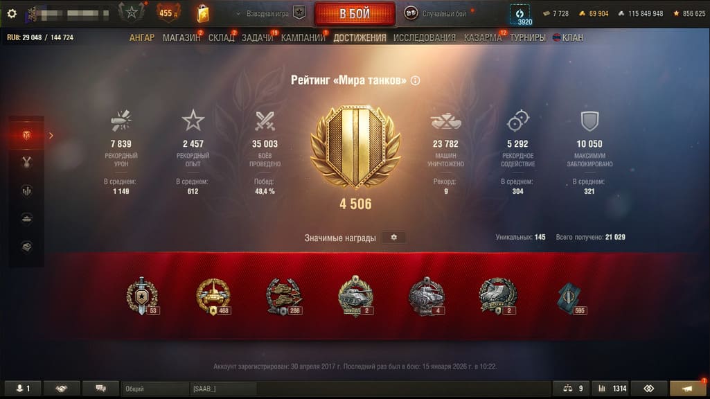 🎌Количество боев: 21 000; 🏆Процент побед: 51%; 💰Количество кредитов: 3.7 млн